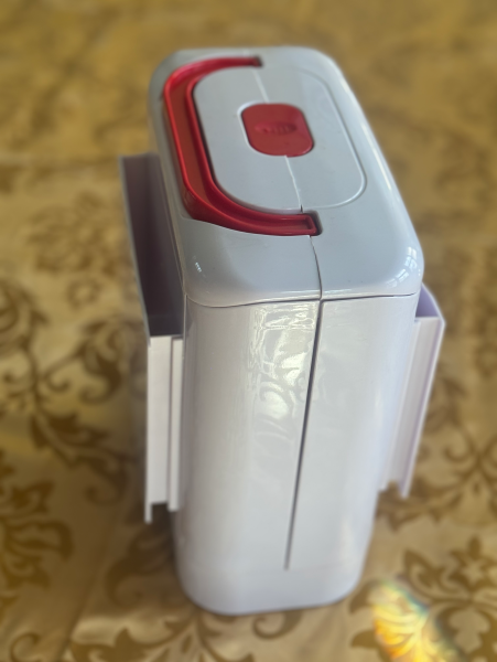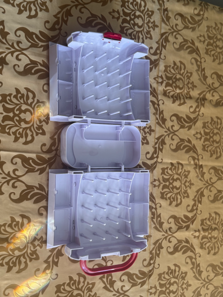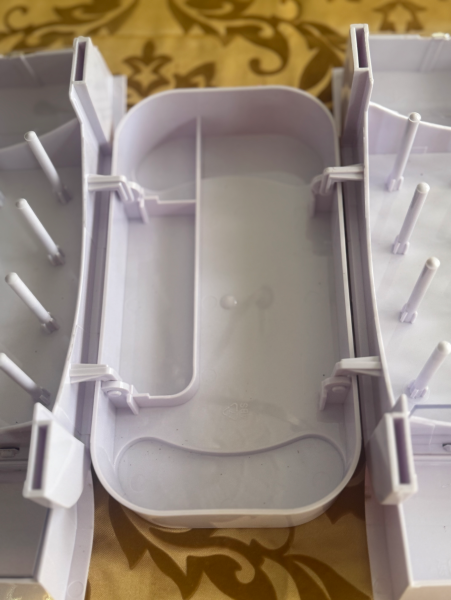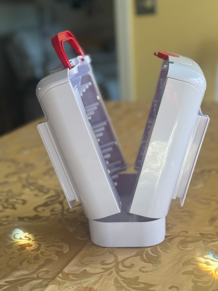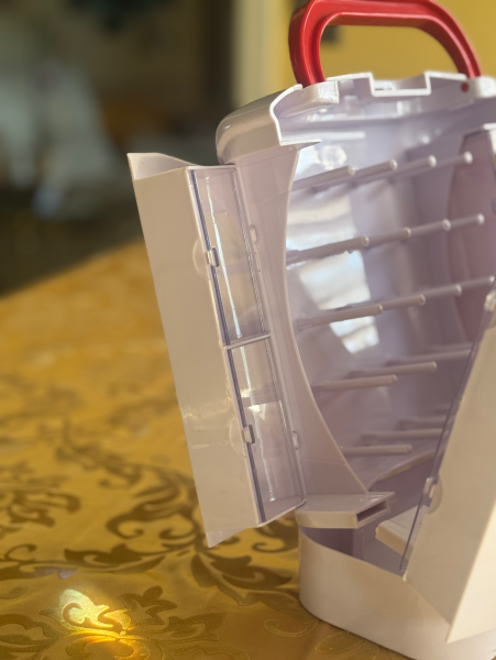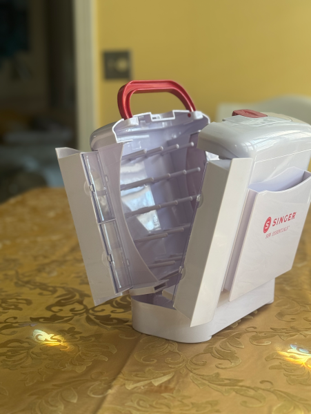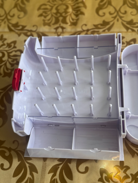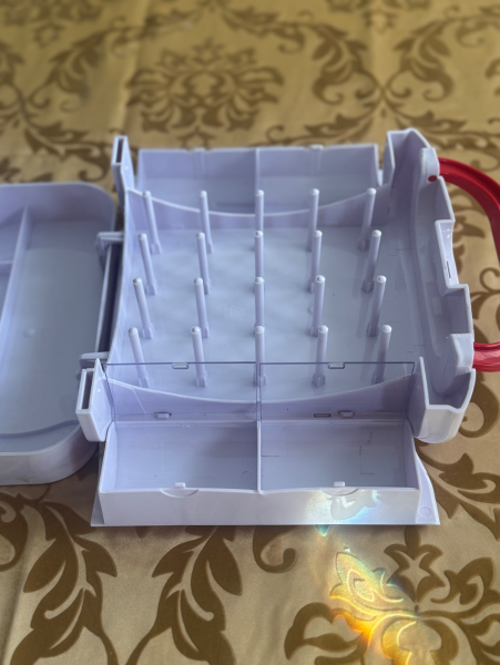 Press the button on the top, open it up and find more storage: for spools, bobbins and other essentials.